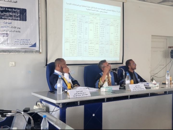 شهدت كلية العلوم البيئية والأحياء البحرية- جامعة حضرموت صباح اليوم الثلاثاء الموافق 21 أكتوبر 2025م، المناقشة العلنية لرسالة الماجستير المقدمة من الباحث علي محفوظ علي يسر، والموسومة بعنوان:*”دراسة جودة المياه المعالجة في معامل التحلية في مدينة المكلا – محافظة حضرموت ومدى مطابقتها للمواصفات القياسية اليمنية”*.