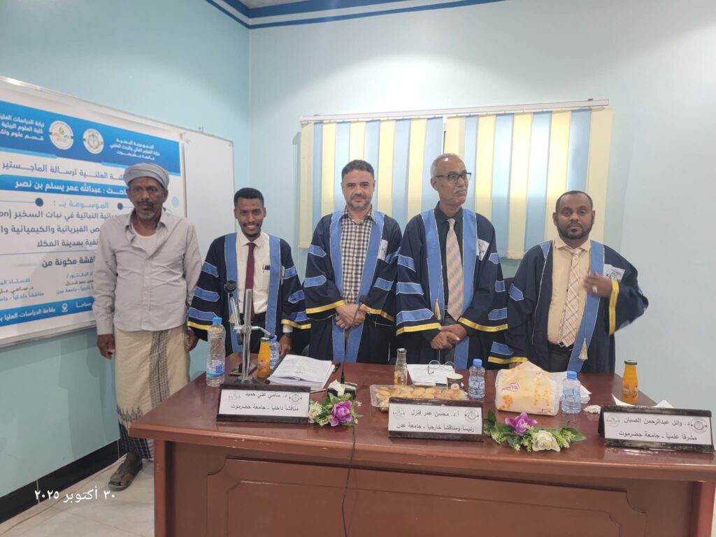 تم يوم الخميس 2025/10/30م مناقشة الماجستير للباحث عبدالله عمر بن نصر بعنوان دراسة تأثير المواد الكيميائية النباتية في نبات السخبر Cymbopogon schoeanthus على الخصائص الفيزيائية والكيميائية والميكروبية لمياه الحنفية بمنطقة فوة المكلاوتشكلت لجنة المناقشة من :الأستاذ الدكتور محسن عمر قنزل رئيسا ومناقشا خارجيا الأستاذ المساعد د. سامي علي حميد مناقشا داخليا الأستاذ المساعد د. وائل عبدالرحمن الصبان مشرفا علميا حيث اثنت لجنة المناقشة على جهد وعمل الباحث وانتهت المناقشة بمنح درجة الماجستير في علوم وتكنولوجيا الأغذية الف الف مبارك على الباحث درجة الماجستير في علوم وتكنولوجيا الأغذية الشكر موصول للباحث على ما بذله من جهد علمي مميز، والتزام أكاديمي واضح، خلال إعداد وتنفيذ بحثه العلمي.لقد أظهر الباحث خلال فترة دراسته مستوى عالٍ من الانضباط والاجتهاد، وتميز في طرح الأفكار، وتحليل البيانات، وعرض النتائج بأسلوب علمي رصين، مما يعكس حرصه على الإسهام الجاد في مجاله الأكاديمي وخدمة قضايا المجتمع.