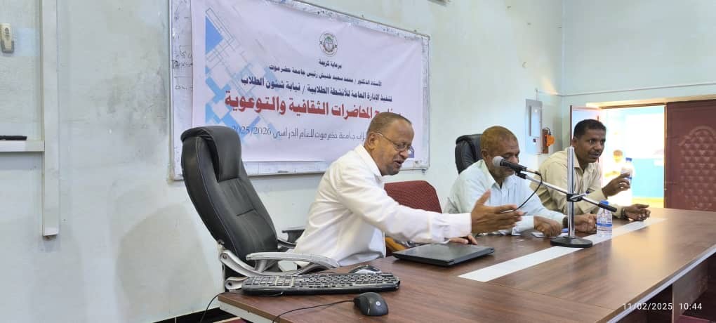 ضمن فعاليات برنامج المحاضرات الثقافية والتوعوية للعام الدراسي 2025-2026م، وتحت رعاية كريمة من الأستاذ الدكتور/ محمد سعيد خنبش رئيس جامعة حضرموت، شهدت قاعة باوزير بمجمع الكليات فوة، يوم الأحد الموافق 2 نوفمبر 2025م، محاضرة نوعية بعنوان “نزاعات المياه في حضرموت: الأسباب والحلول”.