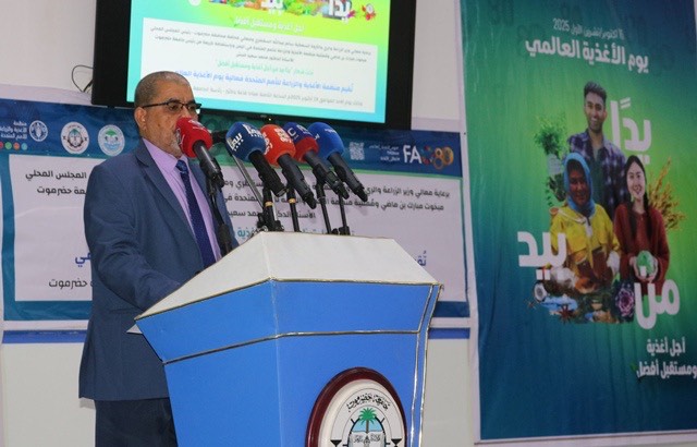 Under the generous patronage of H.E. Major General Salem Abdullah Al-Suqtri, Minister of Agriculture, Irrigation, and Fisheries, and Mr. Mabkhout Mubarak Bin Madi, Hadhramout Governor, Ali Ahmed Ba Kathir Hall at Hadhramout University of hosted the World Food Day celebration, organized by the Food and Agriculture Organization of the United Nations (FAO) in coordination with the Center for Environmental Studies and Water Resources at the University.