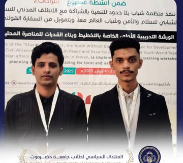 أمسية ملهمة لصناعة الماركة الشخصية في رحاب جامعة حضرموتشؤون الطلاب2 فبراير, 2025إعلام المركز. شهدت قاعة باكثير برئاسة جامعة حضرموت مساء الأربعاء 29 يناير 2025م، حضورًا كبيرًا ومميزًا من الشباب الطموح، في ... المزيد