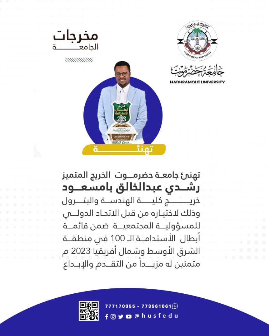 جامعة حضرموت تهنئ الخريج المتميز رشدي عبدالخالق بامسعود وذلك لاختياره من قبل الاتحاد الدولي للمسئولية المجتمعية ضمن قائمة أبطال الاستدامة ال 100 في منطقة الشرق الأوسط وشمال أفريقيا 2023م