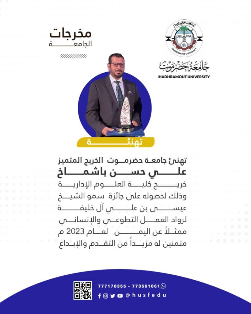 جامعة حضرموت تهنئ الخريج المتميز علي حسن باشماخ وذلك لحصوله على جائزة سمو الشيخ عيسى بن علي آل خليفة لرواد العمل التطوعي والإنساني ممثلاً عن اليمن لعام 2023م