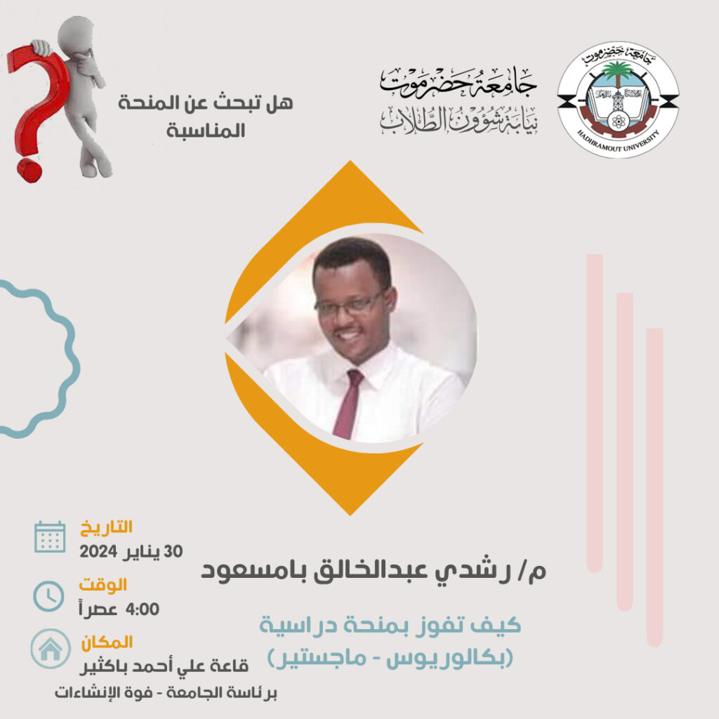 أمسية كيف تفوز بمنحة دراسية (بكالوريوس – ماجستير) مع المهندس رشدي عبدالخالق بامسعود