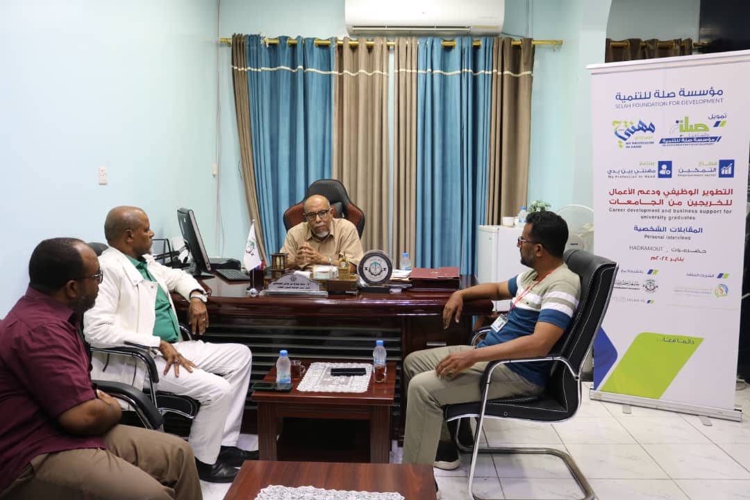 دشن الأستاذ الدكتور سالم مبارك العوبثاني نائب رئيس جامعة حضرموت لشؤون الطلاب، ومعه الأستاذ خالد بن شهاب مدير قطاع تنمية المجتمع بمؤسسة صلة للتنمية، والأستاذ محمد بن سلم مدير أكاديمية نادر النوري للنبلاء بمركز تدريب الطلاب بالجامعة، دشن إجراء المقابلات الشخصية لبرنامج (مهنتي بين يدي 7) الذي ينفذه مركز جامعة حضرموت لتدريب الطلاب، بالشراكة مع أكاديمية نادر النوري للنبلاء، بتمويل من مؤسسة صلة للتنمية؛ بهدف التأهيل الوظيفي لخريجي الجامعات بما يسهم في حصولهم على فرص عمل.