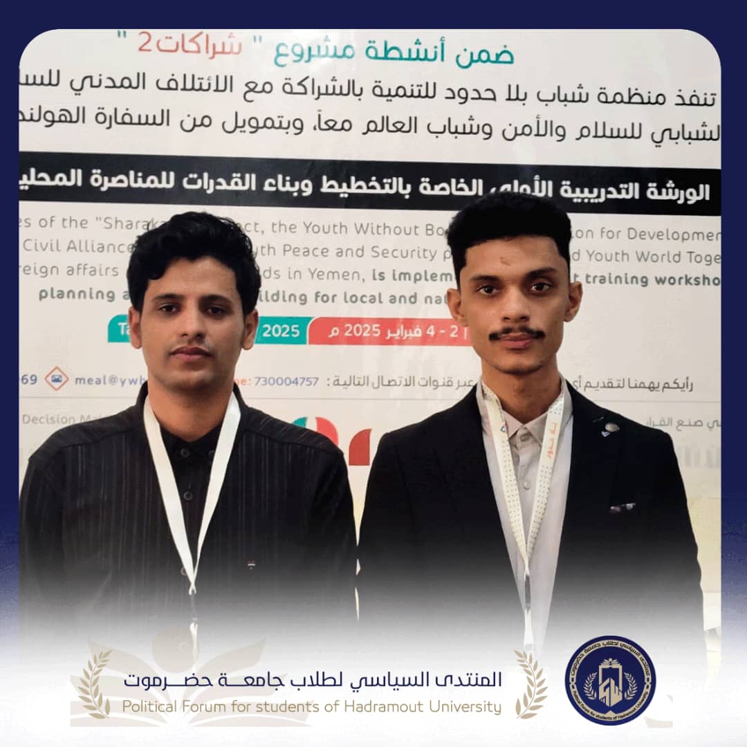 شارك المنتدى السياسي في فعاليات ورشة العمل التي عُقدت تحت عنوان ,, التخطيط وبناء القدرات للمناصرة المحلية ,,، وذلك في ضمن مشروع شراكات 2 الذي تنفذه منظمة شباب بلا حدود للتنمية، بالشراكة مع الائتلاف المدني للسلام والتوافق الشبابي للسلام والأمن وشباب العالم معًا ، بتمويل من السفارة الهولندية باليمن، في محافظة تعز، واستمرت على مدى يومين.