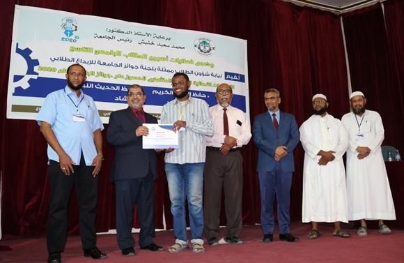 وفي ختام الحفل قام رئيس جامعة حضرموت الأستاذ الدكتور / محمد سعيد خنبش والأستاذ الدكتور / سالم مبارك العوبثاني نائب رئيس الجامعة لشئون الطلاب والأستاذ الدكتور / سالم محمد بن سلمان مساعد نائب رئيس الجامعة لشئون الطلاب والدكتور / سالم عبود غانم رئيس لجنة الجوائز ولجان التحكيم بتكريم الطلاب المتأهلين للتصفيات النهائية لمسابقتي حفظ القرآن الكريم والحديث النبوي، وتسليمهم الشهادات التقديرية .