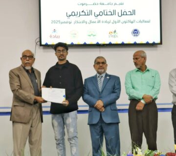 د. خنبش يُكرٍّم الفائزين بالثلاثة المراكز الأولى والرعاة والمشاركين في فعاليات الهاكثون الأول لريادة الأعمال والابتكارشؤون الطلاب22 يناير, 2026حضرموت/ إعلام الجامعة نظمت جامعة حضرموت بقاعة الأديب علي أحمد باكثير برئاسة الجامعة اليوم الحفل التكريمي والختامي لفعاليات الهاكثون الأول ... المزيد