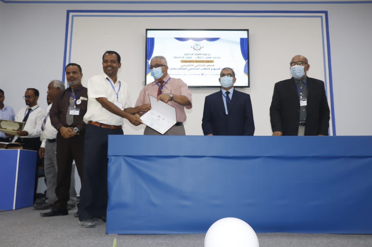 Prof. Mohammed Saeed Khanbesh, HU President honored Dr. Adel Mafoud Basads, General director of Hadhramout University Center For Students Training in the closing ceremony for 10th university week 2021 due to its activities in  the academic year 2020/2021 in the field of training courses to University students.