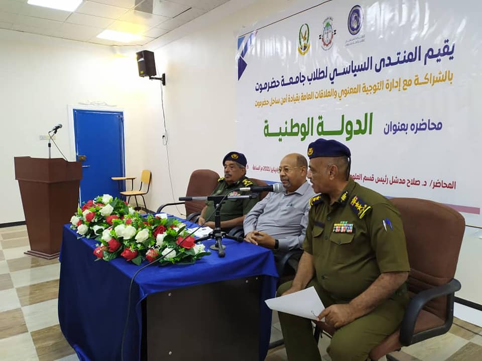 بالشراكة مع إدارة التوجية المعنوي والعلاقات العامة والإعلام بأدارة الأمن والشرطة بساحل حضرموت نظم المنتدى السياسي بجامعة حضرموت محاضرة بعنوان “الدولة الوطنية” والتي أقيمت بقاعة الفقيد اللواء سعيد المحمدي بمعسكر القيادة العامة للأمن والشرطة بساحل حضرموت.